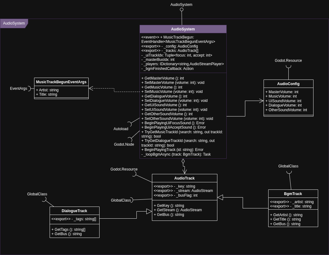 As all systems in the game will, this system consist of a single, complete self-managing autoload interface and its dependencies. This one manages everything from volume configuration to bus management internally so that any UI, messy as it may be, may consume it. Comfy.
