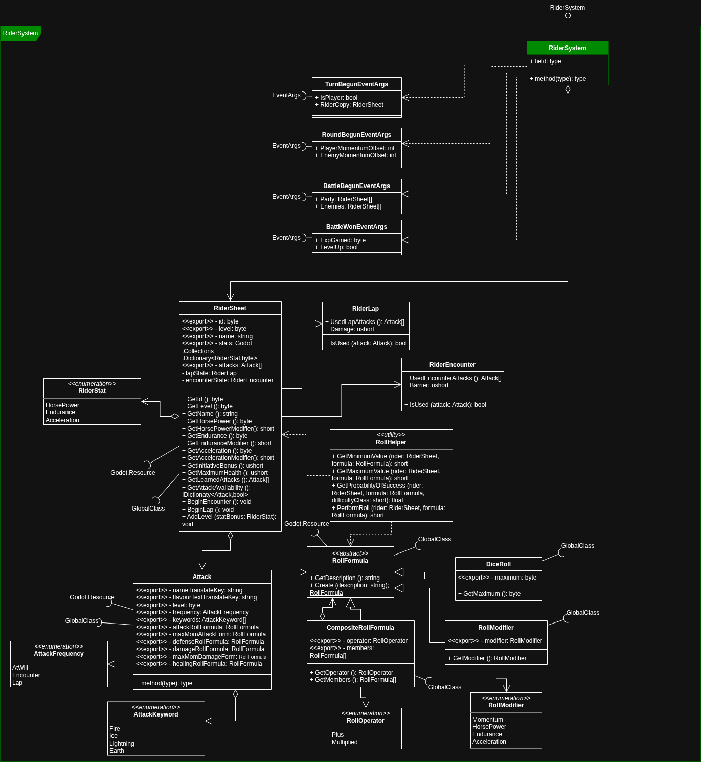 Connoiseurs of the Fourth Edition of Dungeons and Dragons may recognise "Attack" as powers, "Rider" as creature and so on. The resulting system is going to be a much simplified version of it, with the non-spatial battle systems of many JRPGs (no grid, no range) and only the level 1 powers for the four player characters (2 at-will, 1 encounter, and 1 daily a.k.a. lap). The six ability scores have been reduced to horsepower (a.k.a. Strength), endurance (a.k.a. Constitution) and acceleration (a.k.a. Dexterity). There's still a lot to do in this unfinished diagram, of course. The main interface isn't even begun yet!
